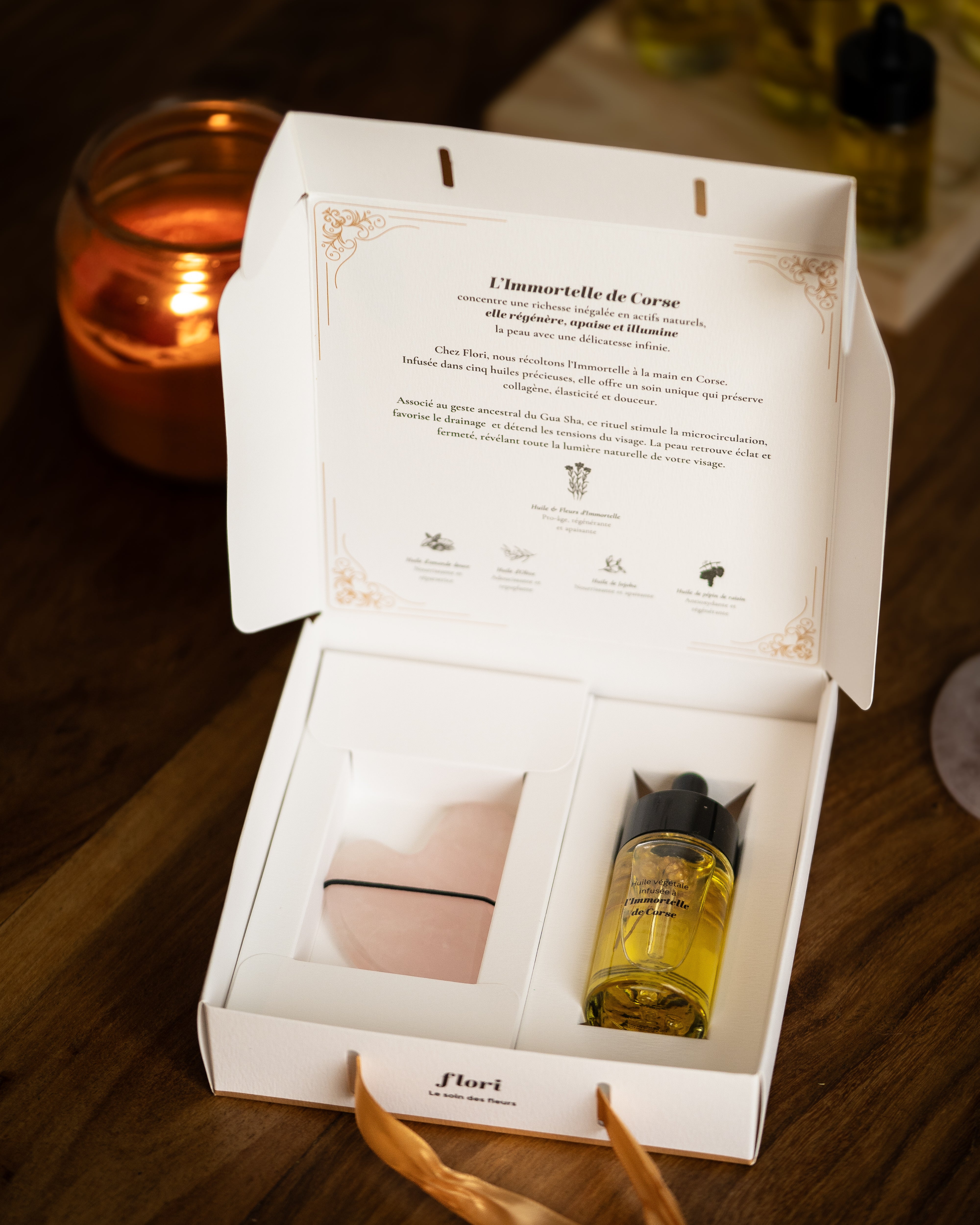 l'huile à l'Immortelle de Corse régénère, apaise et enveloppe la peau d'un soin vivant; Quelques gouttes suffisent.